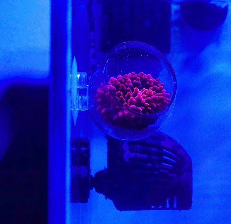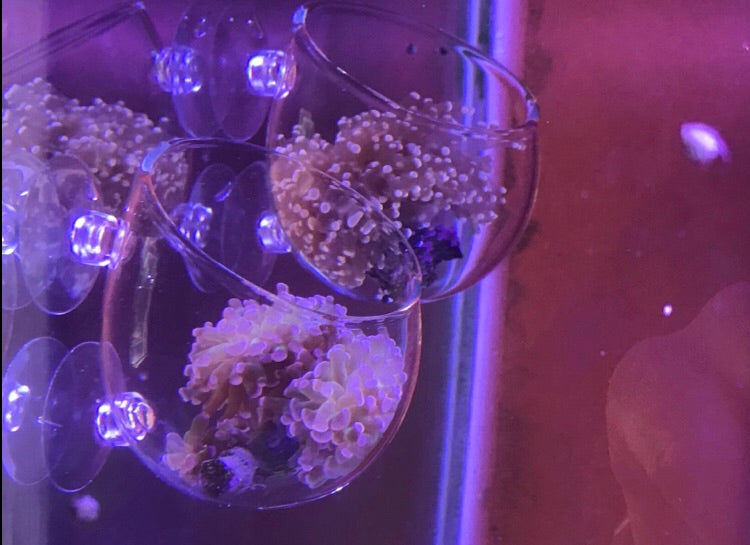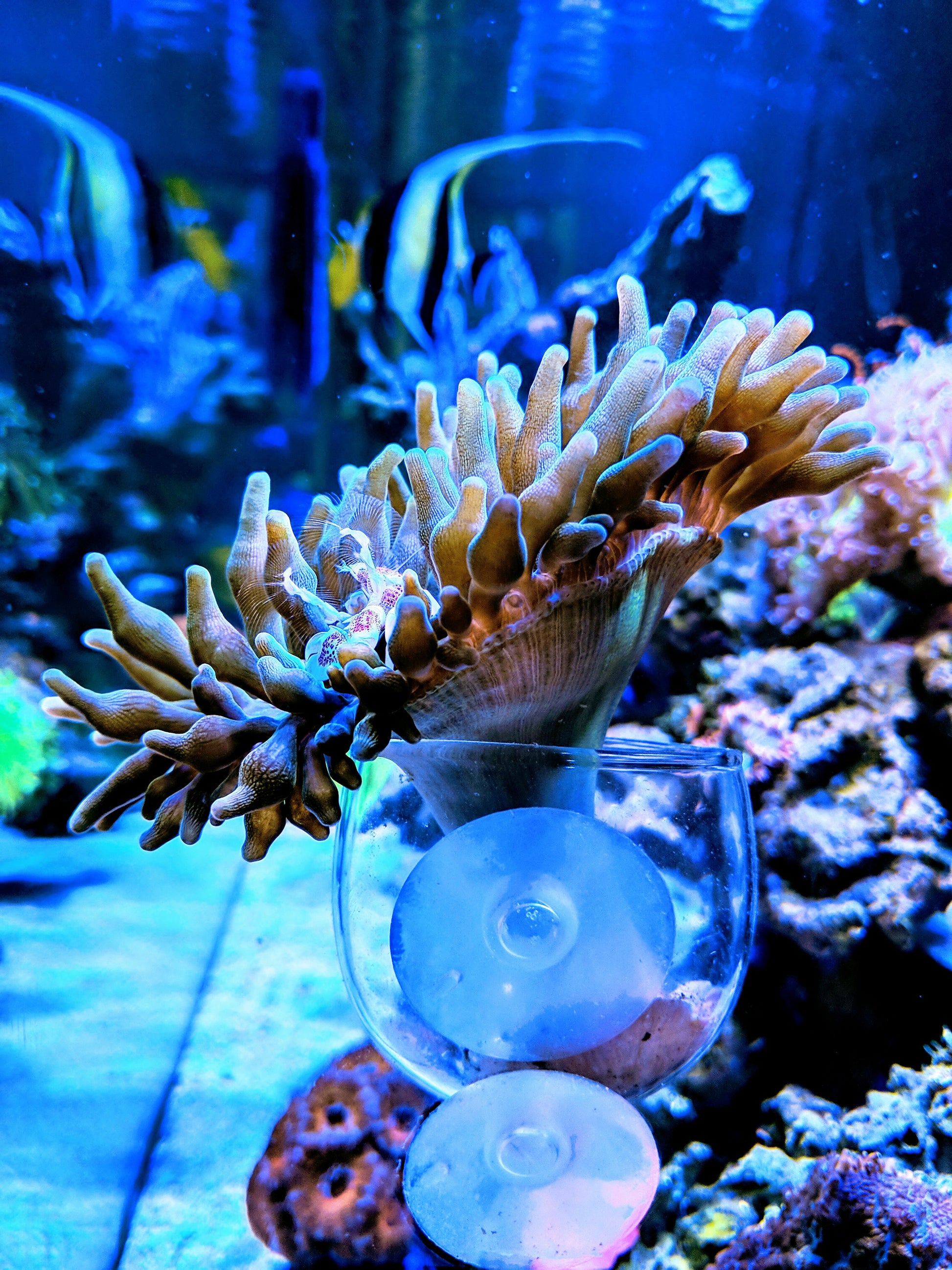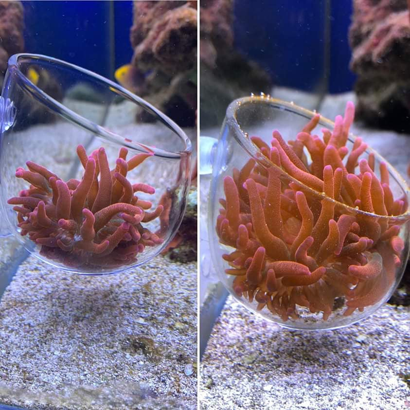 - The Coral Tamer is crafted with crystal glass and features holes at the bottom of the pot which greatly increases the amount of water flow able to pass through the anemone. The Coral Tamer also sticks to your aquariums glass or acrylic by utilizing two heavy duty suction cups to hold it securely in place.